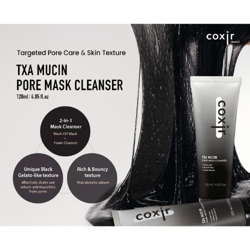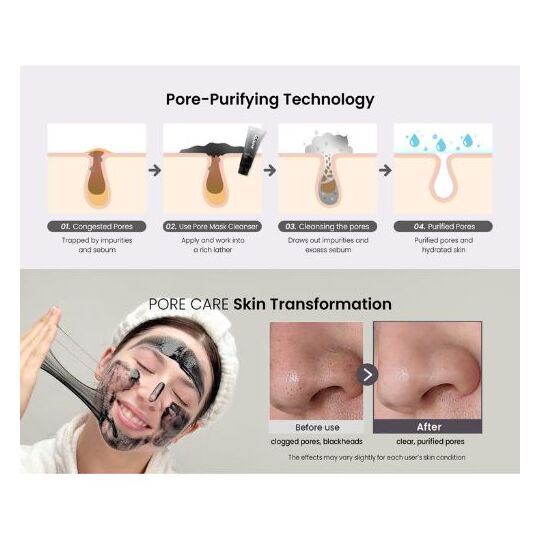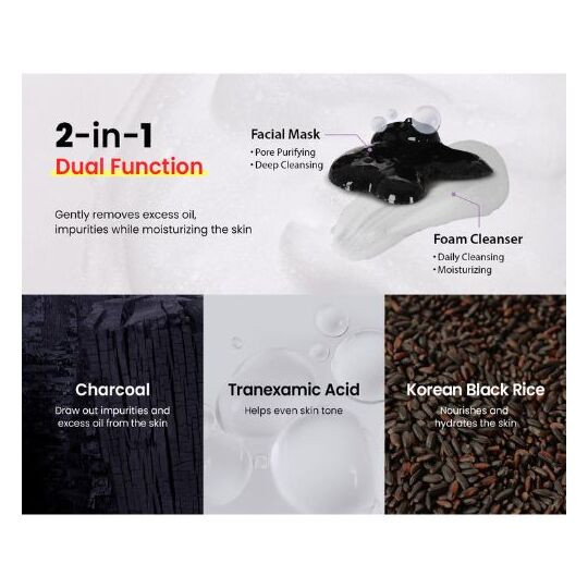 При использовании как маски (1–2 раза в неделю) средство оказывает более интенсивное действие: глубоко очищает, улучшает текстуру и общее состояние кожи, обладает осветляющим эффектом. В состав входят порошок древесного угля, транексамовая кислота, муцин улитки, аргинин и экстракт риса — активные компоненты, которые абсорбируют загрязнения, способствуют увлажнению, выравнивают тон, питают кожу и поддерживают её барьерные функции, делая её гладкой, мягкой и ухоженной.